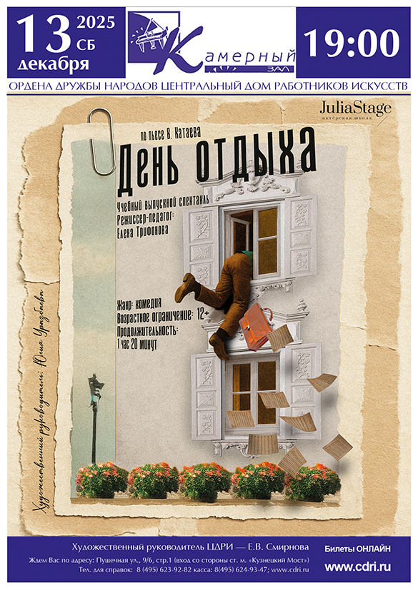 Спектакль «День отдыха», поставлен по одноимённой комедии положений Валентина Катаева. Герои спектакля, по тем или иным причинам, оказываются в Доме отдыха «Сыроежки», после чего сюжет закручивается стремительно!