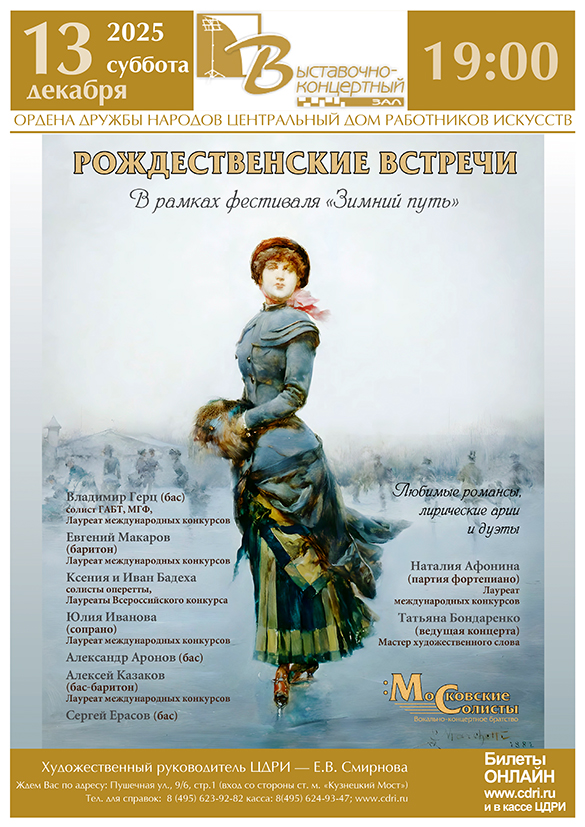 В рамках XIII ежегодного фестиваля Winterreise (Зимний путь) в Москве пройдет концерт при свечах в Выставочно-концертном зале ЦДРИ — это и радостно, и волшебно... Изысканная европейская духовная музыка, арии из опер, лирические дуэты, прекрасные голоса исполнителей — лауреатов всероссийских и международных конкурсов — и чудесные звуки рояля — создают неповторимую атмосферу романтики и духовности.