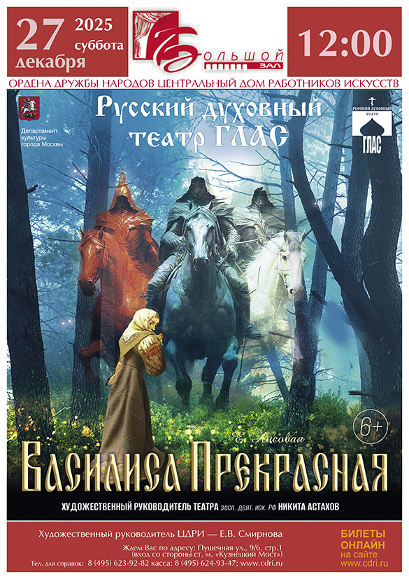 А испытаний у Василисы впереди немало, ведь она повстречается с Бабой Ягой и ее слугами: Всадником Белый День, Всадником Красное Солнце, Всадником Черная Ночь. Но, сколько бы сказочные тропинки не плутали, сколько бы не вились в темном лесу вокруг хижины Бабы Яги, а все равно приведут Василису на лесную опушку, навстречу судьбе и доброй Старушке — няньке царской!