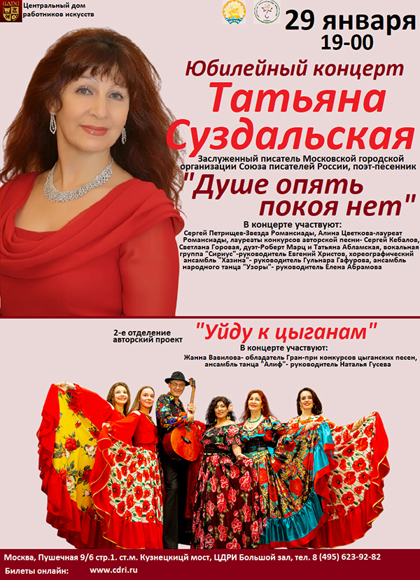 Юбилейный концерт Татьяны Суздальской — заслуженного писателя МГО СПР, поэта-песенника, композитора, автора-исполнителя, лауреата всероссийских и международных конкурсов авторской песни.